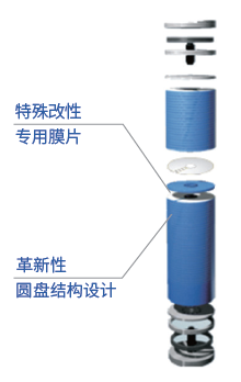 其核心結(jié)構(gòu)為特殊改性的專(zhuān)用膜片和革新性導(dǎo)流盤(pán),膜片與導(dǎo)流盤(pán)的間歇部分為進(jìn)水的敞開(kāi)式通道,導(dǎo)流盤(pán)上的凹槽是滲透水的流道。