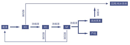 膜法濃縮技術(shù)優(yōu)于傳統(tǒng)離子交換工藝,其濃縮效率高,出水水質(zhì)好,濃縮液和透過也均可回用。處理后出水可回用到生產(chǎn)工序中,金屬的回收率能達到99%以上,基本實現(xiàn)零排放。