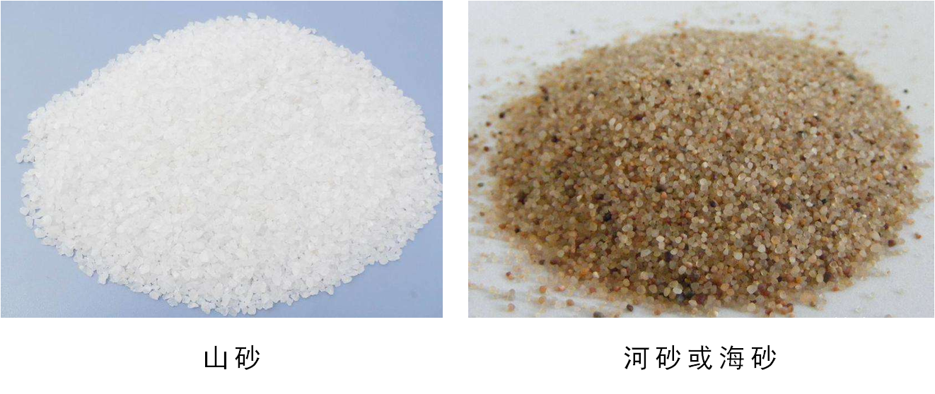 河砂或海砂挖掘而來(lái)的海岸砂質(zhì)或從河流漫灘沉積砂,其顆粒圓滑,來(lái)源廣,但?;煊胸愵?lèi)碎片,海砂還含較多鹽分。