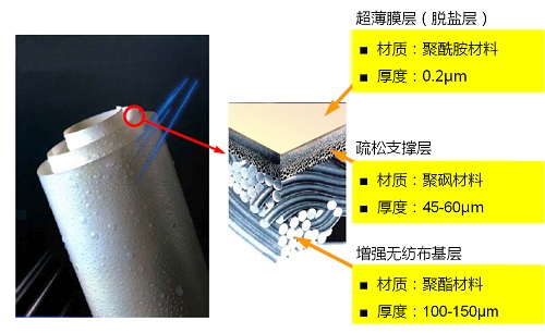 卷式反滲透膜膜片為復(fù)合結(jié)構(gòu),一般由三層組成: