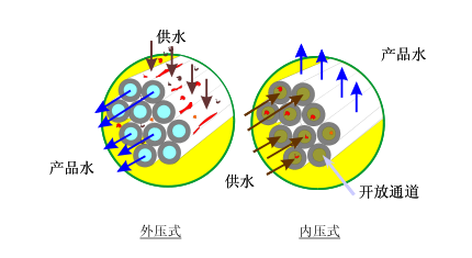 中空纖維超濾膜通常由表面一層非常薄而致密的皮層和該皮層底下多孔的支撐層構(gòu)成。致密皮層為功能層,起到過濾和截留污染物的作用。根據(jù)制造和成型的工藝不同,致密皮層可在纖維絲的內(nèi)表面(內(nèi)壓式)或外表面(外壓式)。