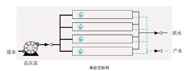 增加反滲透膜給水側(cè)的切向流速是降低反滲透污染的有效方法之一,在其他條件(產(chǎn)水量、回收率、膜通量)不變的情況下,切向流速的大小取決于排列方式。常規(guī)的水處理系統(tǒng)膜排列結(jié)構(gòu)為多段排列,而在廢水回用時應采用濃水循環(huán)單段排列。采取濃水循環(huán)單段排列的方式,其目的是通過增大濃水流量,加大反滲透膜表面的切向流速,減緩污染物富集。采用多段排列設計時,一段反滲透濃水為二段反滲透進水,在含鹽量增加的同時,反而進水壓力降低、水量減少,污染的速度將大大加快。采用濃水循環(huán)單段排列設計,雖然原水與濃水混合后,反滲透進水總含鹽量上升,但由于增大了進水流量,每支反滲透膜的污染和負荷均等,降低系統(tǒng)壓差,增加物理性的沖刷效率,減少反滲透膜的污染和清洗次數(shù),延長反滲透膜的使用壽命。