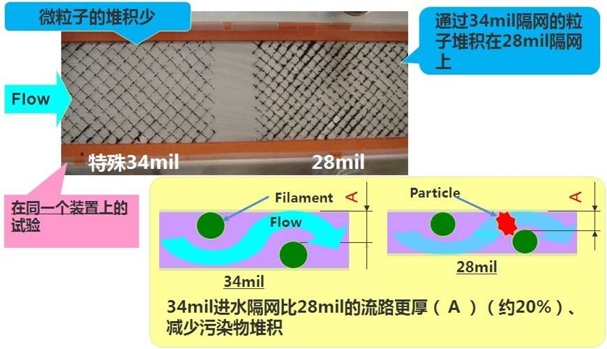 在眾多抗污染的機理中,反滲透膜元件給水流道的寬度已經(jīng)是公認的膜元件抗污染性能的最重要指標,也是用戶在選擇產(chǎn)品時需要考慮的重點。進水流道越寬,系統(tǒng)對進水水質(zhì)的要求和預處理設備不正常工況的要求相對來說越寬松。較寬的進水流道,可以更有效的進行膜清洗,即使在高污染條件下,系統(tǒng)仍可維持較低的壓降。但是進水隔網(wǎng)厚度增加時,由于進入膜元件給水的流量不變,導致給水在流道內(nèi)流動的速度降低,加強了膜表面的濃差極化現(xiàn)象,進而使污染物更易在膜表面吸附。因此,進水隔網(wǎng)的厚度存在一個最優(yōu)范圍,且隨膜元件不同的應用領(lǐng)域而不同,在線路板廢水回用中應選用流道寬度為34mil的反滲透膜元件。