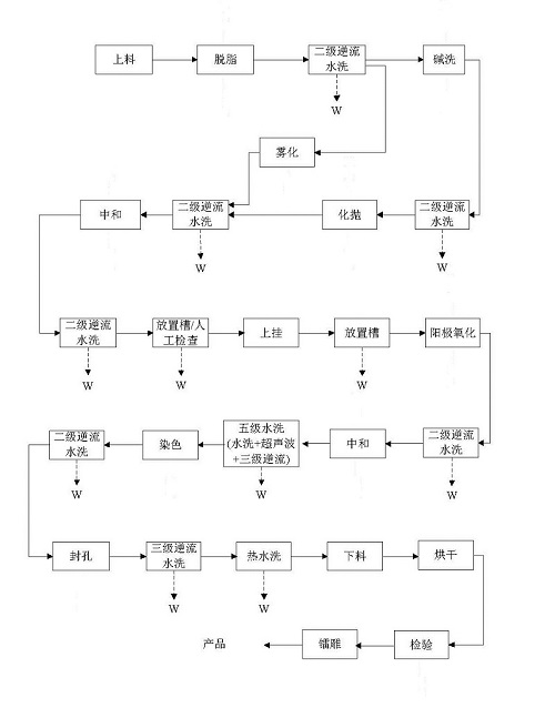 陽極氧化生產(chǎn)線工藝流程及產(chǎn)排廢水(W)示意圖