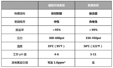 醋酸纖維素膜最高可以耐受1ppm的游離氯,而氯和氧化劑會(huì)造成聚酰胺膜損壞。