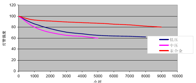 紫外線殺菌器是純水系統(tǒng)一種常用的對(duì)水體進(jìn)行殺菌消毒的設(shè)備,紫外線燈管的使用壽命不是指燈管熄滅的時(shí)間,而是指燈管的發(fā)光效率低于消毒殺菌所需要的有效值,無(wú)法提供足夠的紫外線輻射量,從而影響殺菌消毒的效果。影響燈管使用壽命的主要原因是燈管內(nèi)部的汞會(huì)慢慢釋放到燈管內(nèi)壁,因此會(huì)逐步影響燈管的紫外線強(qiáng)度。為了保證紫外線殺菌器的殺菌效果,必須定期更換紫外線燈管。各類燈管使用壽命如下圖: