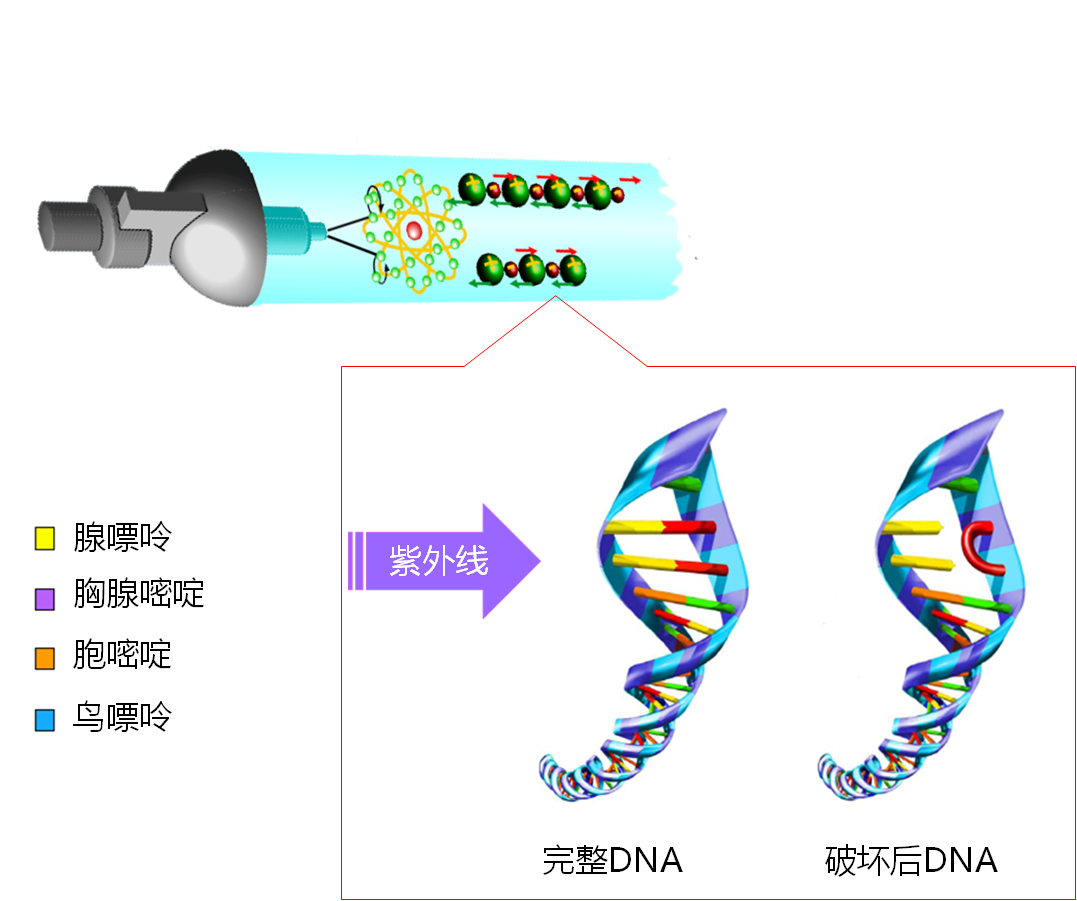 波長(zhǎng)介于200~280nm之間,其中240~280nm紫外線為細(xì)菌及病毒DNA所吸收,從而破壞細(xì)菌及病毒DNA,使其不能復(fù)制繁殖。DNA在265nm處具有最大吸收峰。