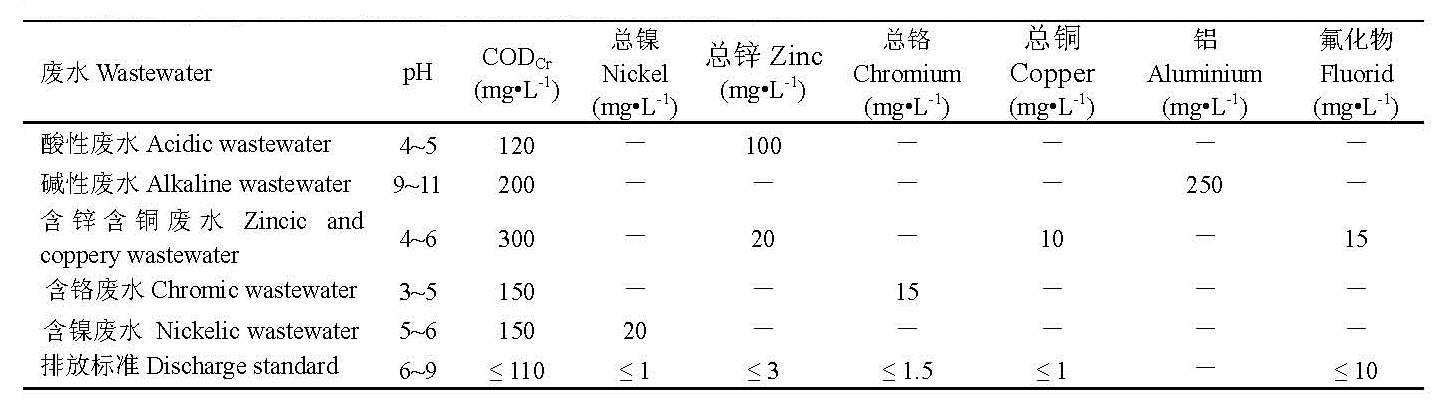 鋁合金輪轂生產(chǎn)廢水主要來(lái)源于輪轂涂裝堿洗工序的堿性廢水和電鍍生產(chǎn)線的酸性廢水、含鋅含銅廢水、含鉻廢水和含鎳廢水。各種類型廢水的主要污染物濃度如表 1所示。