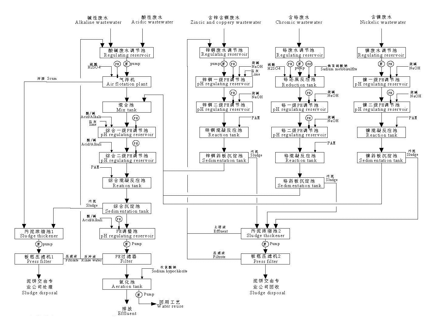 由于鋁合金輪轂生產(chǎn)廢水種類較多,污染物成份復(fù)雜,因此,采取了分流收集、分類處理的方法,先將各類生產(chǎn)廢水預(yù)處理后,再進(jìn)行綜合處理。含鉻廢水和含鎳廢水進(jìn)行單獨(dú)處理,處理達(dá)到《水污染物排放限值》(DB44/26-2001)第一類污染物最高允許排放濃度后,才可進(jìn)入混合池綜合處理。綜合處理達(dá)標(biāo)后的廢水再進(jìn)行反滲透處理回用于生產(chǎn),剩余的廢水排入項(xiàng)目所在地附近的河涌。項(xiàng)目水處理工藝見圖 1。