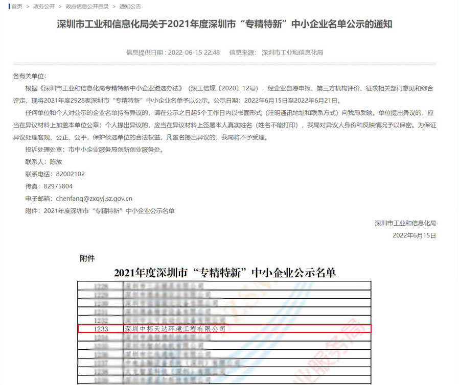 6月15日,深圳市工業(yè)和信息化局發(fā)布2021年度深圳市“專精特新”中小企業(yè)名單公示通知,中拓環(huán)境入選為2021年深圳市“專精特新”中小企業(yè)。