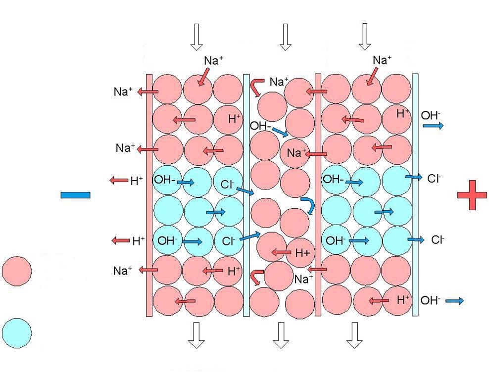 ● 模塊兩端的電極提供了橫向的直流電場,電流驅(qū)動水中的陽離子(如鈉離子Na+)透過陽離子膜,反之陰離子(如氯離子Cl-)透過陰離子膜,并防止陰陽離子由另一側(cè)濃水室進(jìn)入淡水室(陰離子不能透過陽離子膜,陽離子不能透過陰離子膜),水從離子膜表面流過而不能透過離子膜。陰陽離子從淡水室遷移到濃水室。在此過程可以去除大多數(shù)的強(qiáng)電解質(zhì)物質(zhì),離子交換樹脂起到簡單的導(dǎo)體作用。