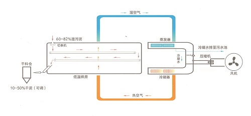 低溫污泥干化是利用除濕熱泵對(duì)污泥采用熱風(fēng)循環(huán)冷凝除濕烘干,除濕熱泵烘干是利用制冷系統(tǒng)使來自干燥室的濕空氣降溫脫濕同時(shí)通過熱泵原理回收水分凝結(jié)潛熱加熱空氣達(dá)到干燥物料目的。除濕熱泵是除濕(去濕干燥)加熱泵(能量回收)結(jié)合,是干燥過程中能量循環(huán)利用,除濕干化過程基本沒有廢熱排放。